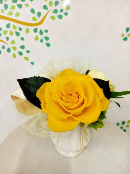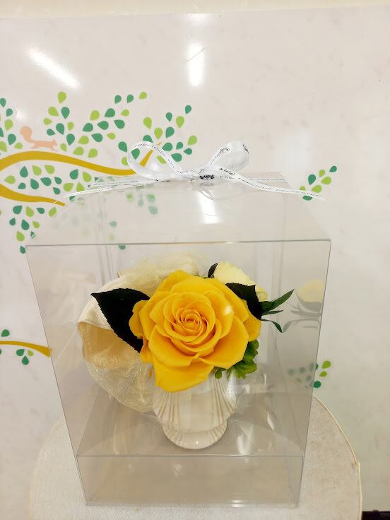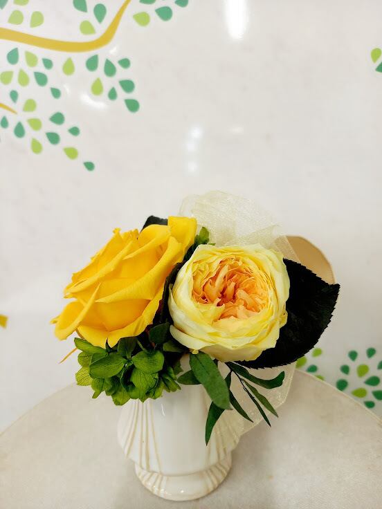 プリザーブドフラワー:ローズ・ローズてまり(又はローズミルフィーユ)・アジサイ・ローズリーフ・ユーカリニコリ
